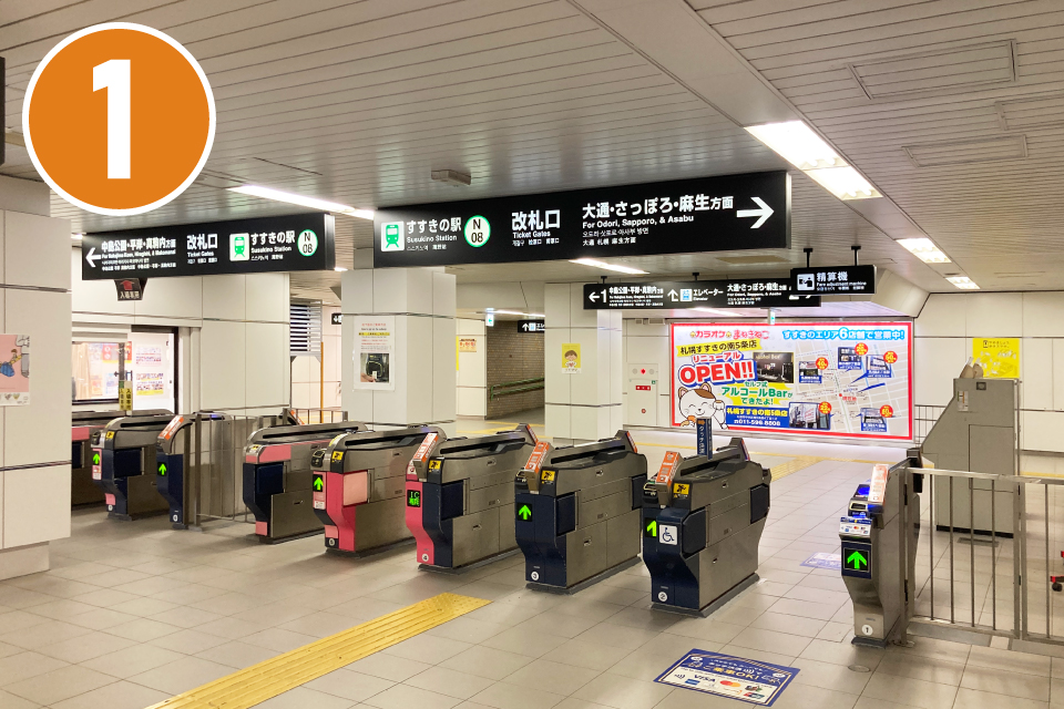 ①地下鉄南北線【すすきの駅】の改札口から出ます。