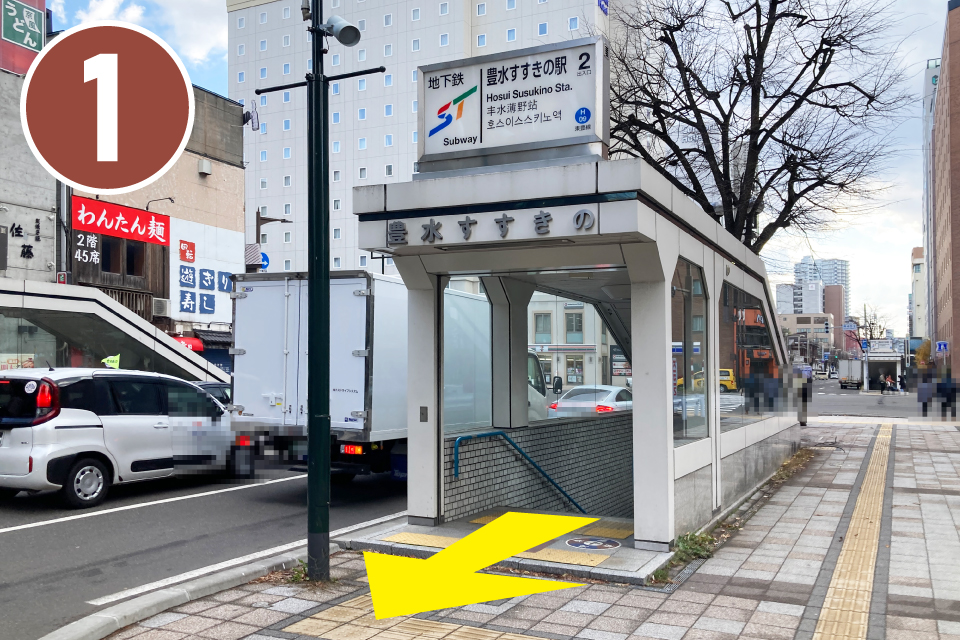 ①地下鉄東豊線【豊水すすきの駅】の2番出口から出てまっすぐ進みます。