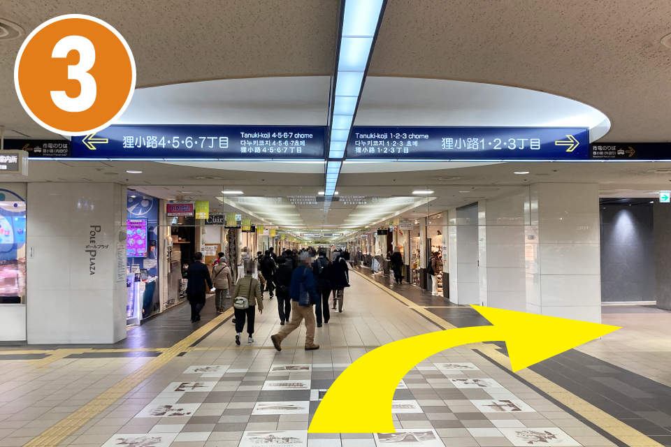 ⑥狸小路2丁目までの横断歩道を渡り、すぐ右に曲がります。
